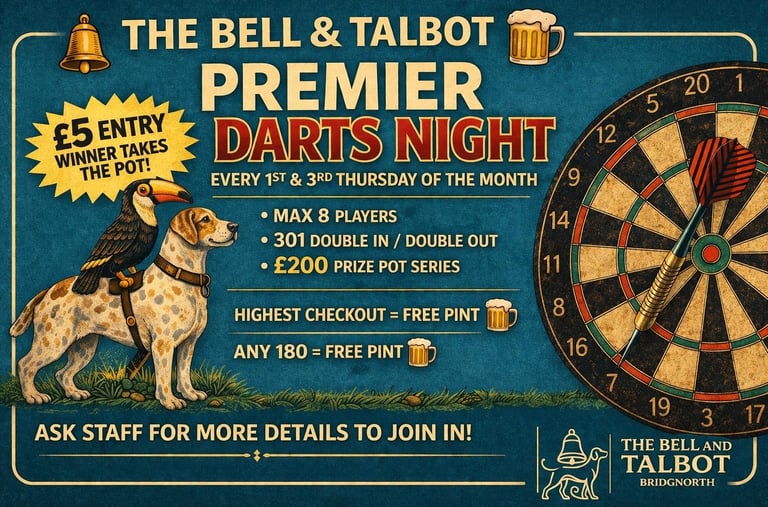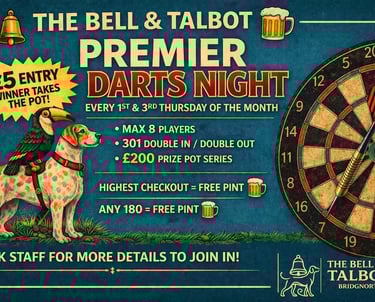 Join us at the Bell & Talbot for Knockout Darts every 1st and 3rd Thursday of the month. Entry is £5 per person, with the winner taking the pot on the night. Players also earn points based on their finishing position, building up over the season for a chance to win the £200 prize pot.