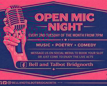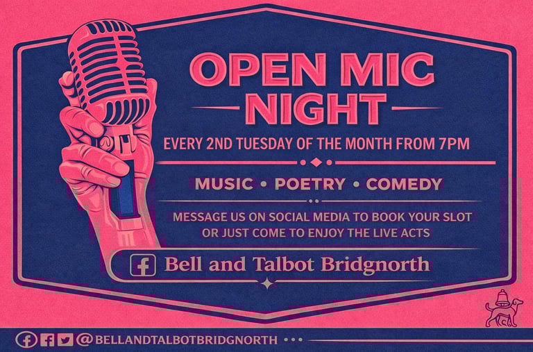 Join us at the Bell & Talbot for our Open Mic Night, held every second Tuesday of the month from 7pm. Whether you’re a musician, poet, comedian, or just fancy giving it a go, all acts are welcome in a relaxed and supportive atmosphere. Come along to perform or simply enjoy a great evening of local talent and entertainment.